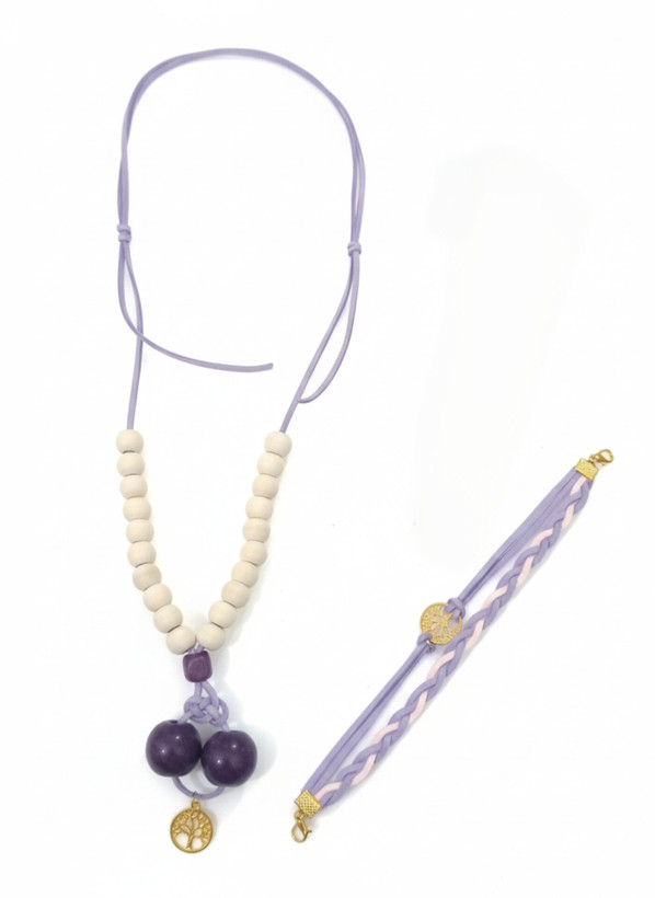 رنگ: دستبند - رنگ بند: یاسی (بنفش روشن) - رنگ آویز: طلایی - بدون مهره / گردنبند - رنگ بند: یاسی (بنفش روشن) - رنگ مهرهها: سفید و بنفش - رنگ آویز: طلایی (درخت زندگی)