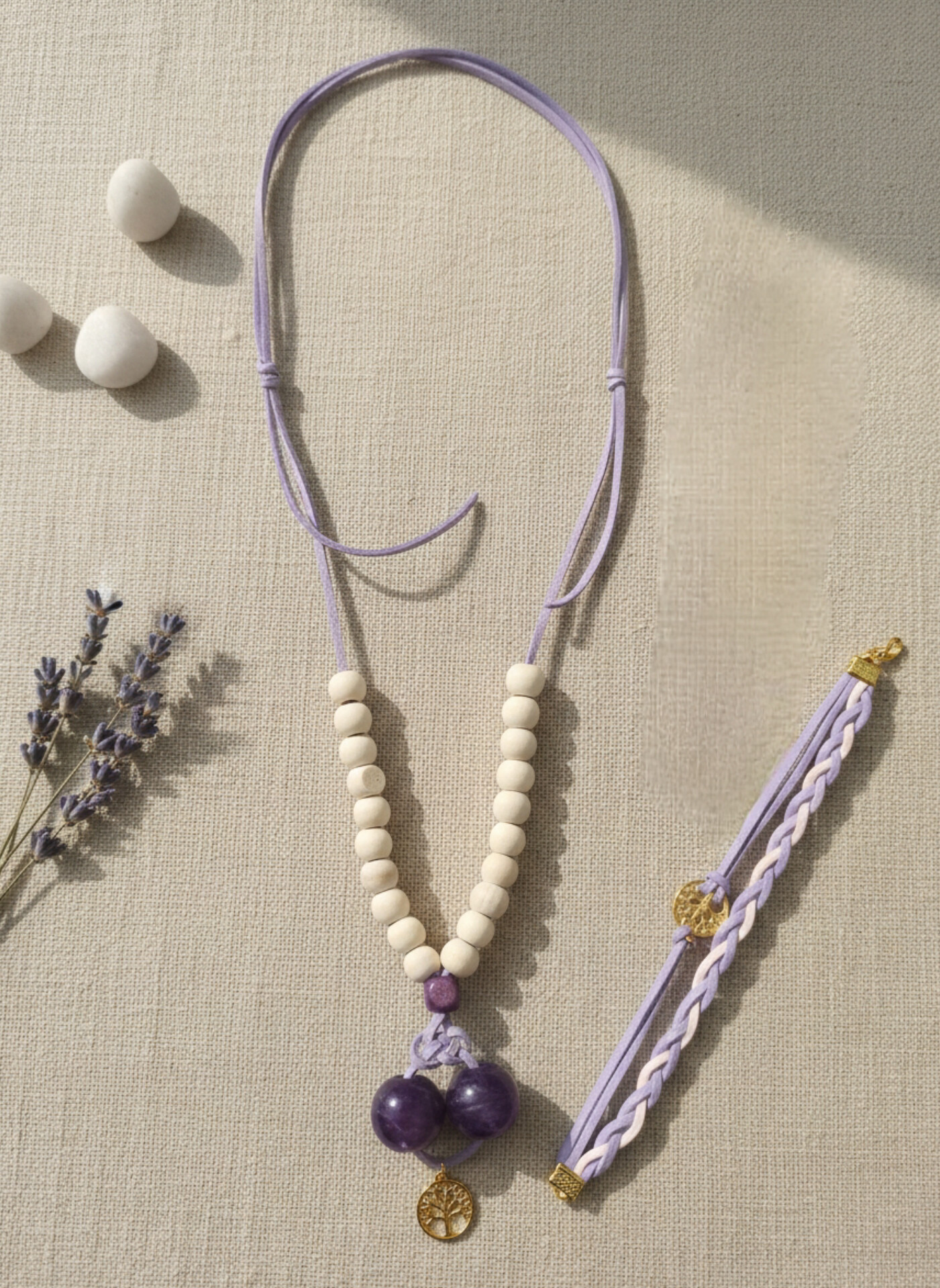 رنگ: دستبند - رنگ بند: یاسی (بنفش روشن) - رنگ آویز: طلایی - بدون مهره / گردنبند - رنگ بند: یاسی (بنفش روشن) - رنگ مهرهها: سفید و بنفش - رنگ آویز: طلایی (درخت زندگی)