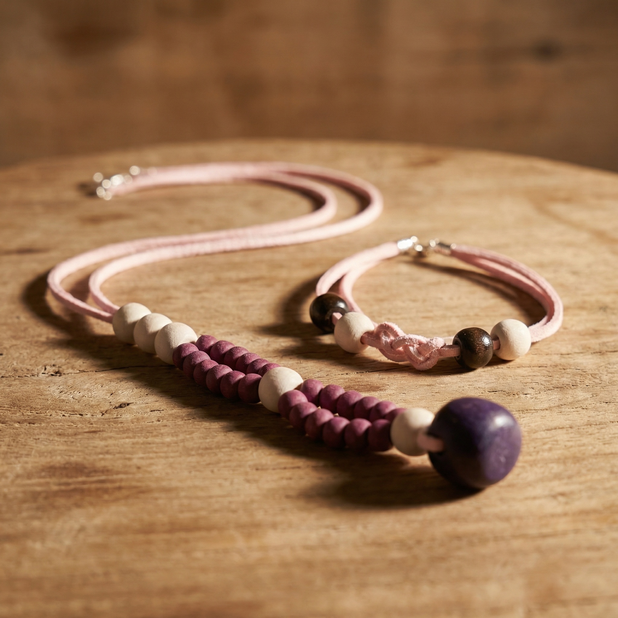 ست دست‌ساز صورتی – گردنبند مهره‌ای و دستبند بافت با قفل فلزی